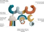 • A quilted rainbow toy features two hexagon clinking rings that help encourage reaching and grasping