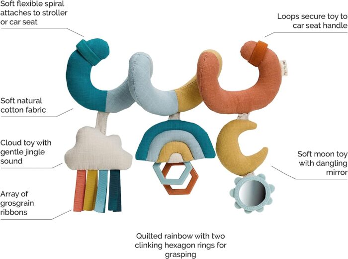 • Itzy Ritzy’s spiral car seat and stroller activity toy features 3 interactive hanging toys that will keep your baby entertained during car rides, walks and other adventures