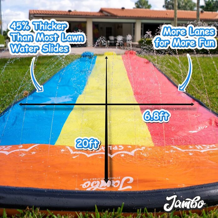 • 💧 1 YEAR WARRANTY: We’re so confident you’ll love the JAMBO Slip Splash and Slide, we provide a complimentary 1 Year Warranty with your purchase. We want you and your family to make countless wonderful memories sliding down the Extra Long Triple Lane Slip Splash and Slide!