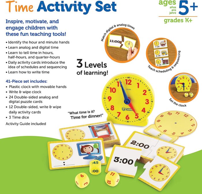 • 41-Piece Set includes plastic clock with movable hands, write & wipe clock, 24 double-sided analog and digital puzzle cards, 12 double-sided, write & wipe daily activity cards, 3 time dice plus activity guide.